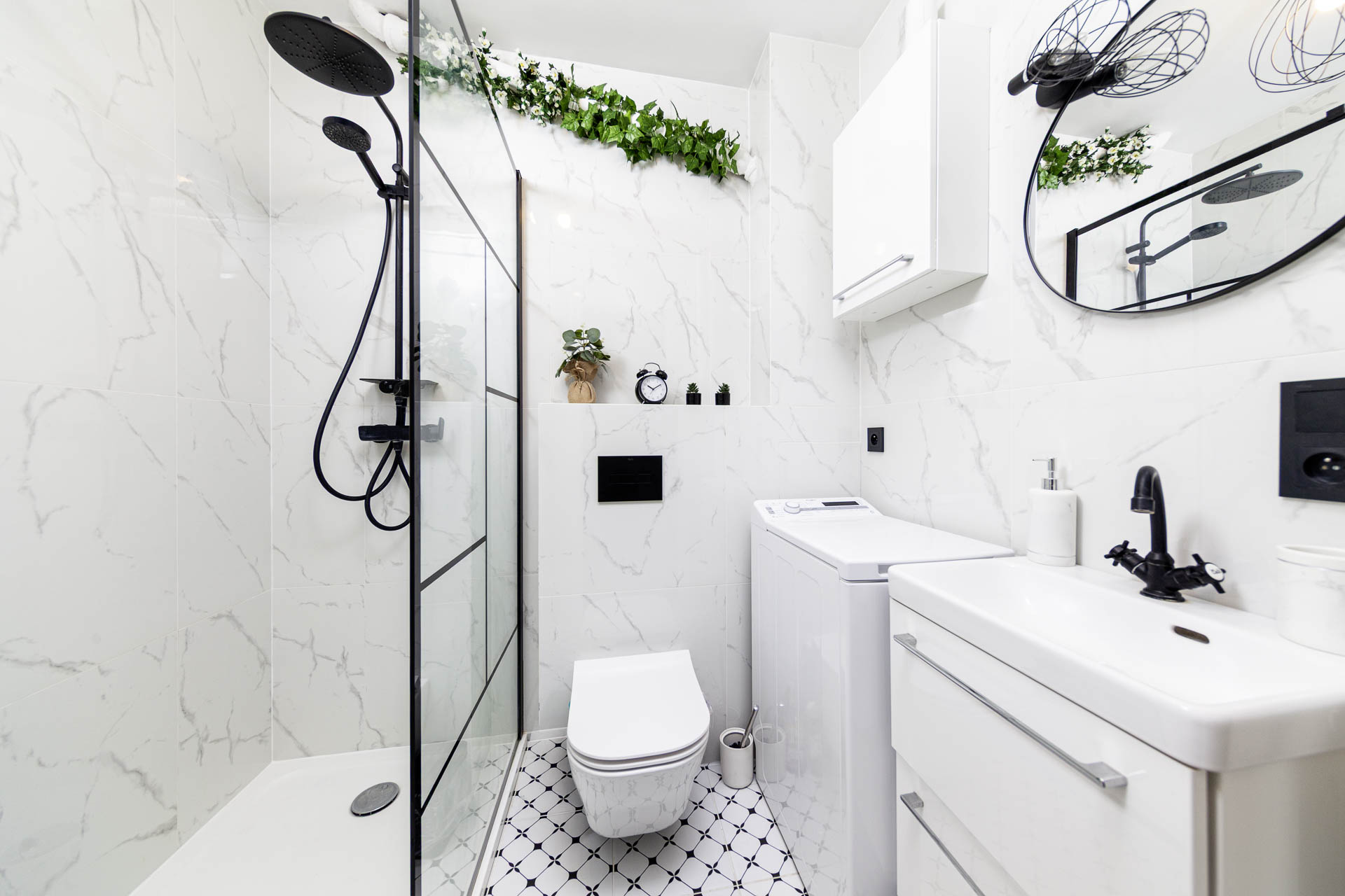 - Łazienka: nowoczesna, z prysznicem, pralką i elegancką armaturą.