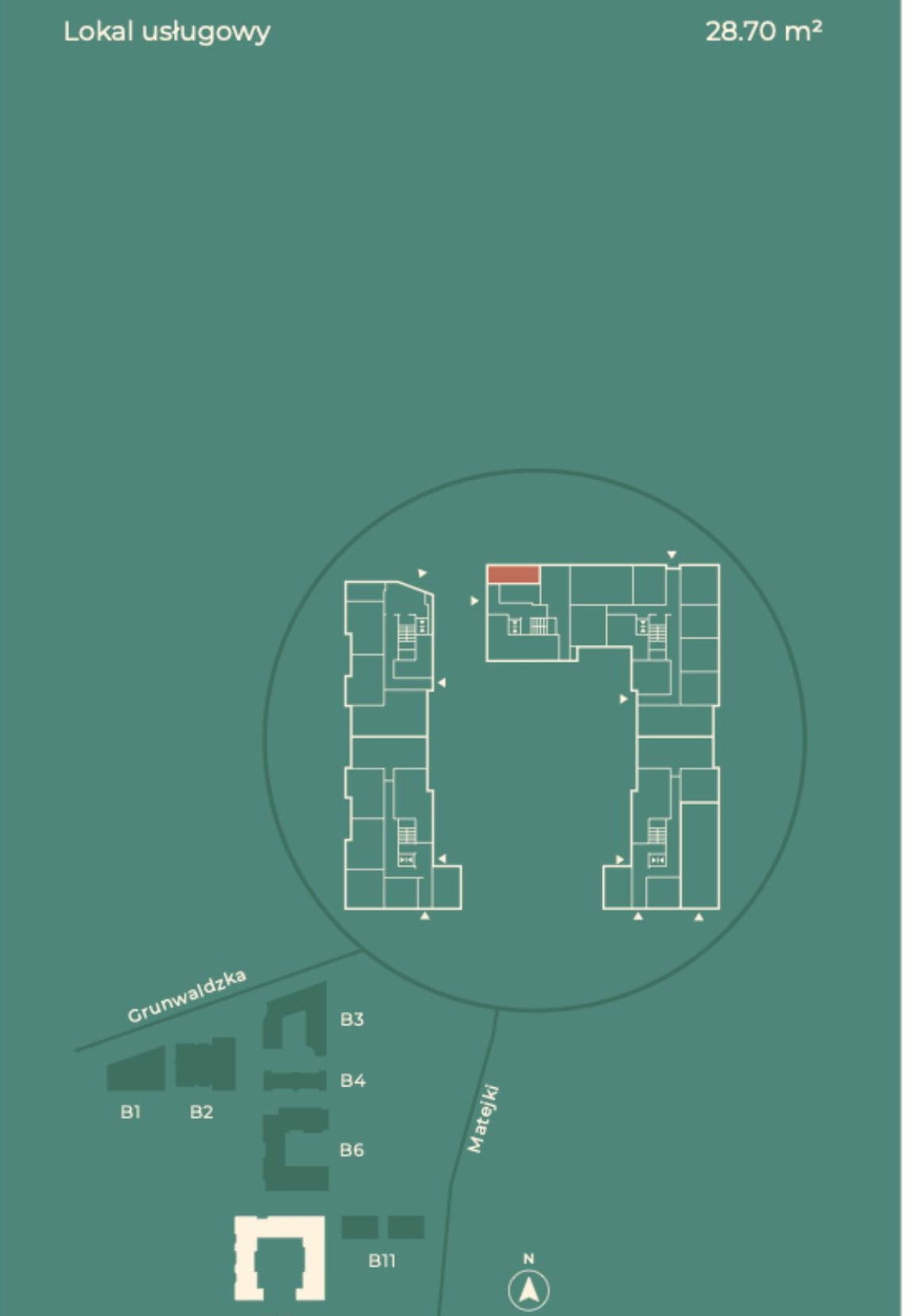 Lokal bardzo dobrze skomunikowany z centrum miasta. Przystanek tramwajowy “Matejki” przy ul. Grunwaldzkiej znajduje się w odległości 400 m, a przystanek tramwajowy “Park Wilsona” przy ul. Głogowskiej w odległości 500 m. Natomiast przystanek autobusowy znajduje się tuż przy ul. Matejki, zaledwie 1-minutę od lokalu.